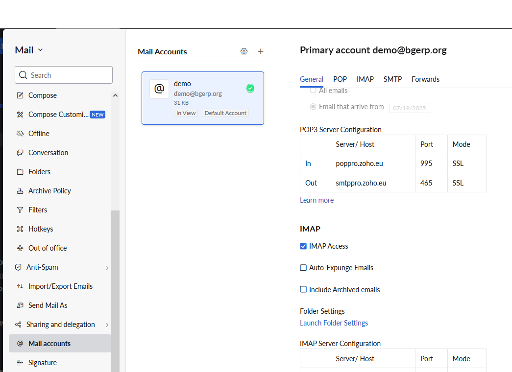 Log to the account on https://mail.zoho.eu in, click Setting on the top right corner, and enable IMAP access there.