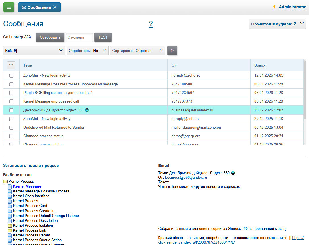 EMail переписка, звонки, сообщения HelpDesk учитываются с привязкой к конкретным процессам. На них можно назначить кураторов, получающих все уведомления о новых сообщениях. Переписка выносится из личных контактов пользователей, в случае необходимости вся история доступна и продолжить общение сможет другой исполнитель.