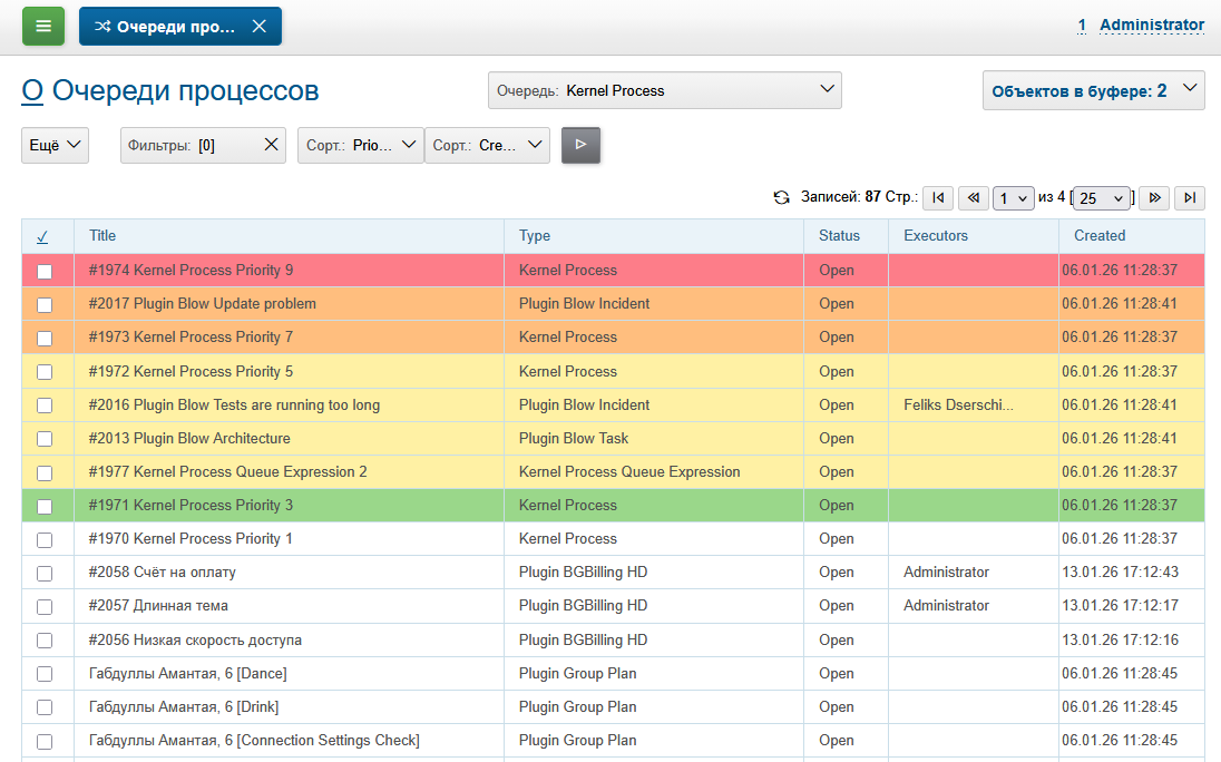 Процессы могут быть необходимым образом параметризованы, также настраиваются их допустимые состояния, исполнители и подразделения. Пользователям они предоставляются в виде очередей, для которых настраивается требуемые фильтры, отображаемая информация, режимы сортировки. Таким образом учитывается практически всё: от продаж и отправки писем до подключений и обслуживания абонентов.