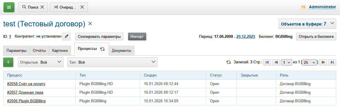 Договоры BGBilling доступны для поиска, просмотра и редактирования в интерфейсе BGERP, что позволяет большинству сотрудников работать с биллингом в браузере, без установки полнофункционального Java приложения-клиента. Процессы привязываются к относящимся договорам, копируя требуемые параметры и сохраняя историю взаимодействия с абонентами.