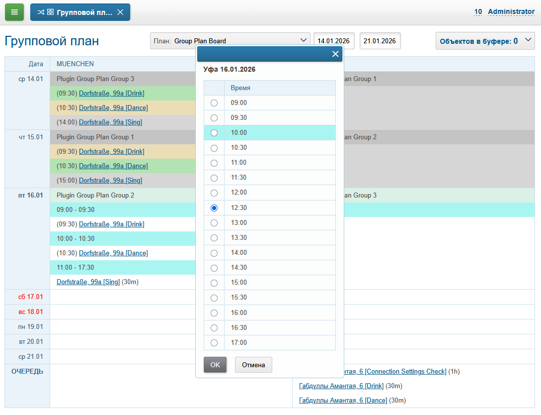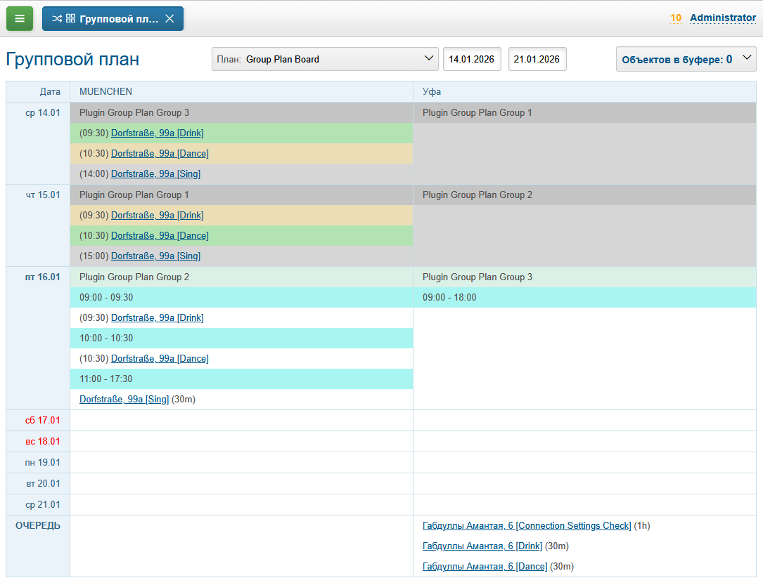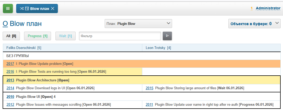 Сразу два плагина, Blow и Group Plan, позволяют организовать эффективное планирование работы персонала различных подразделений. Первый ориентирован на последовательно выполняемые согласно приоритетам проекты, разбитые на взаимосвязанные подэтапы с разными исполнителями. Второй - на небольшие независимые задачи с заранее назначаемым временем исполнения, подобные визитам к клиентам.