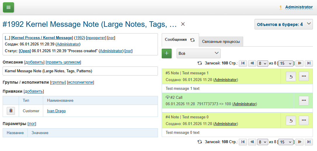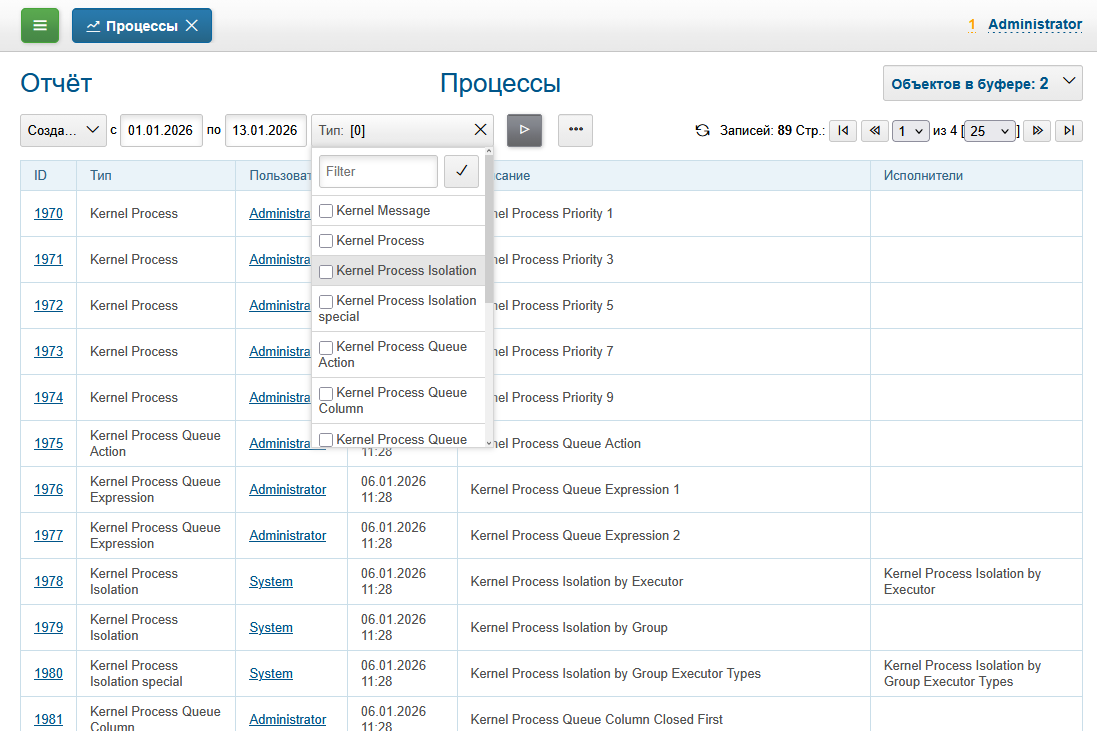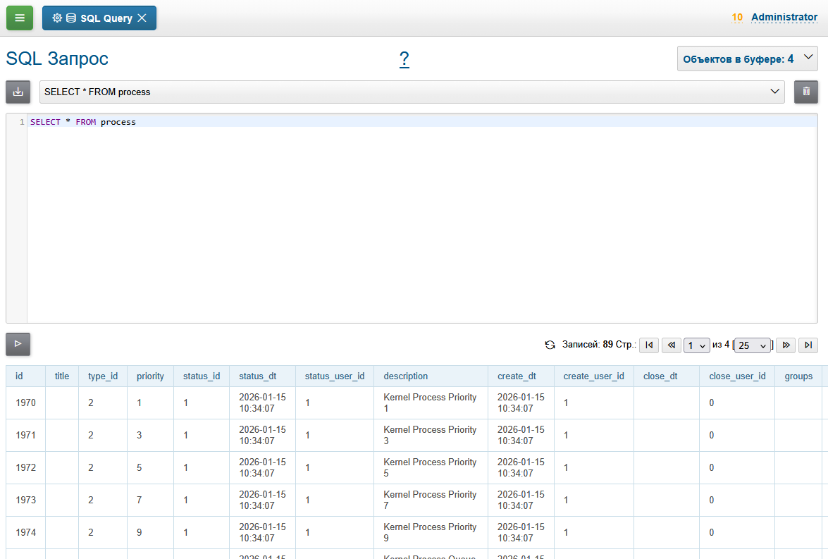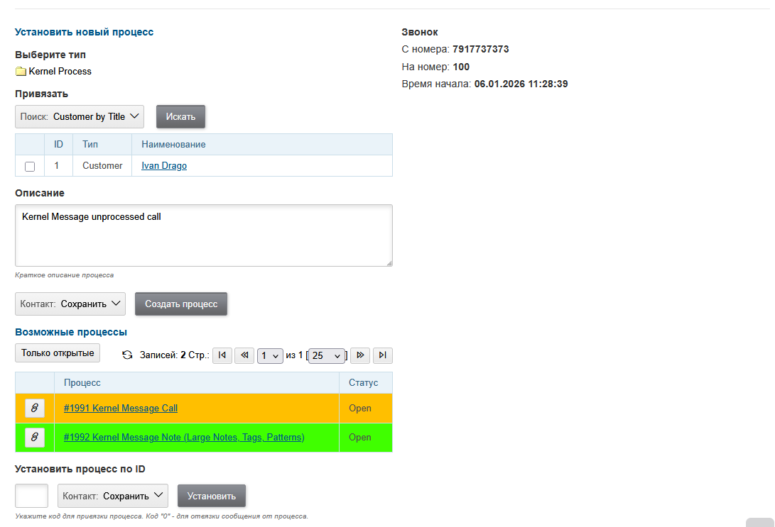 Процессы могут быть необходимым образом параметризованы, также настраиваются их допустимые состояния, исполнители и подразделения. Пользователям они предоставляются в виде очередей, для которых настраивается требуемые фильтры, отображаемая информация, режимы сортировки. Таким образом учитывается практически всё: от продаж и отправки писем до подключений и обслуживания абонентов.