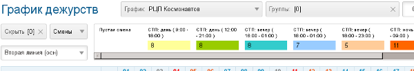 График дежурств соотносит смены с исполнителями-членами групп. График позволяет учитывать рабочее время сотрудников, назначать время исполнения процессов, выгружать табель использования рабочего времени.