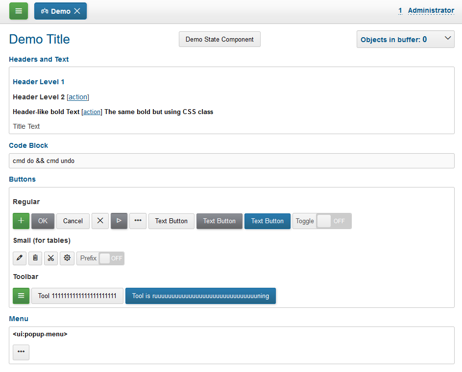 System functions are organized as object hierarchy built from the $$ root object. For example: $$.ajax, $$.ui A typical scheme for attaching JS code to HTML is to setup event handler with a function call - AJAX example